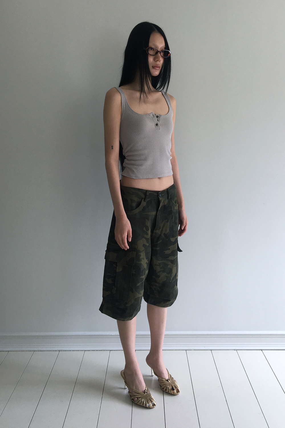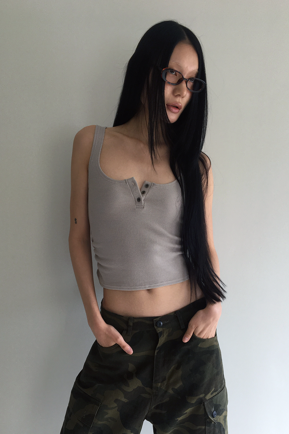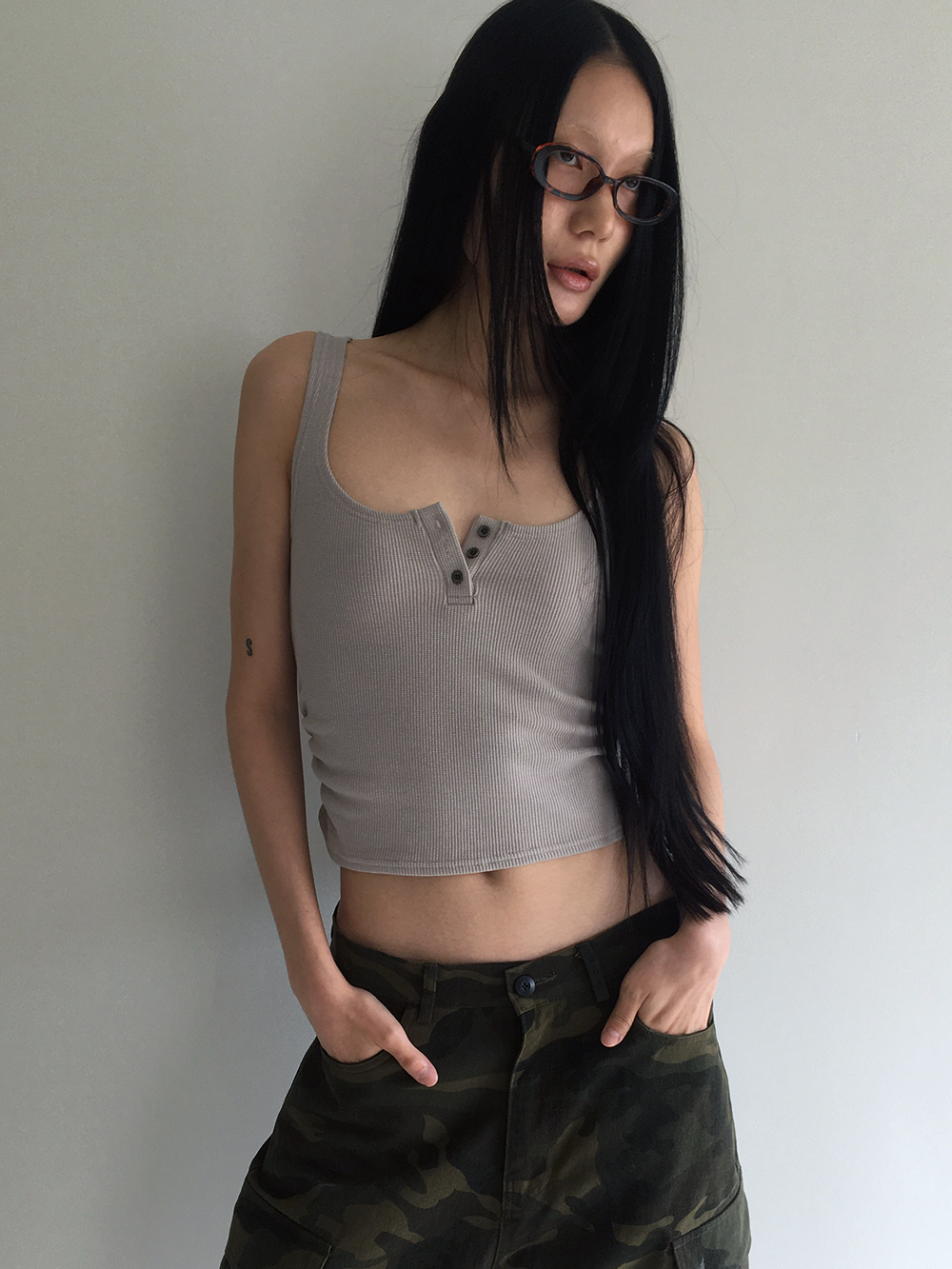 Waffle shirring tank top beigeSALE